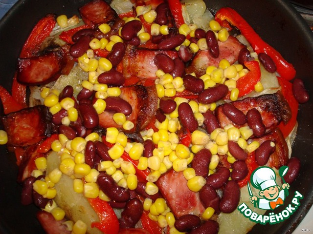 Откинуть на дуршлаг фасоль и кукурузу.