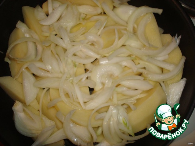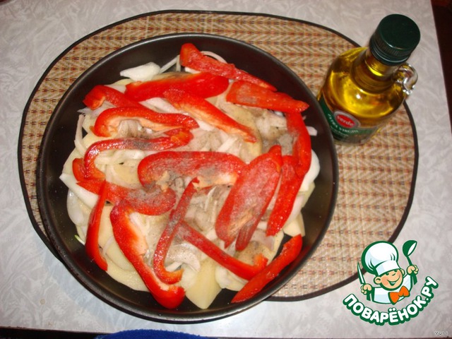 Положить на картофель и лук. Посолить, поперчить и полить все обильно оливковым или подсолнечным маслом.