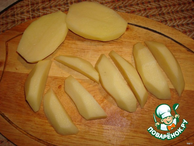 Картофель разрезать вдоль на 4 части. Поместить в форму для выпекания.