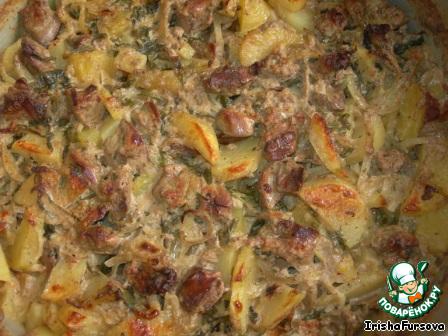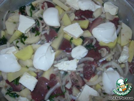 Форму слегка смазываем маслом, картошку перемешиваем с печенью и луком, добавляем зелень и выкладываем в форму