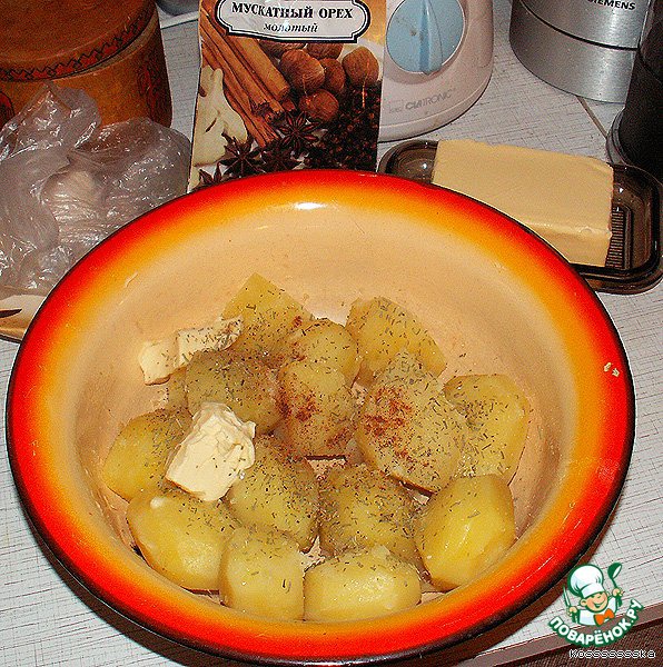 Картофель чистим и подвариваем на пару до полуготовности. Вываливаем в миску, добавляем сливочное масло, немного соли, мускатный орех и розмарин, перемешиваем.
