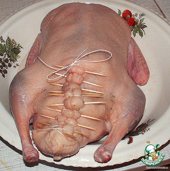 Отверстие в утке скрепляем зубочистками и зашиваем.
