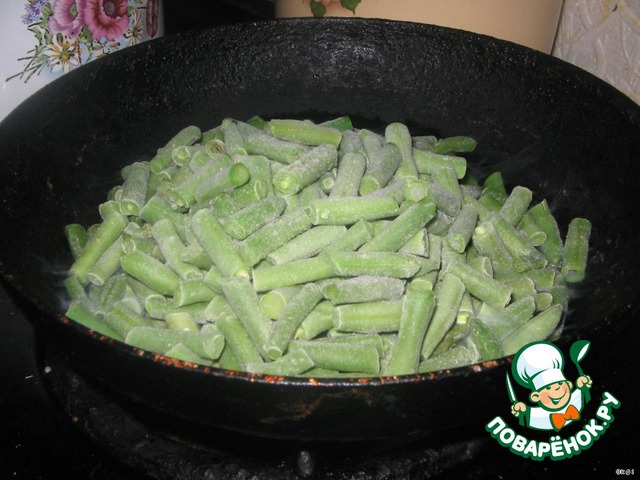 Замороженную стручковую фасоль (я брала целую пачку - 400 гр) высыпать на сковороду, добавить немного растительного масла и обжарить, чтобы фасоль стала мягкой.