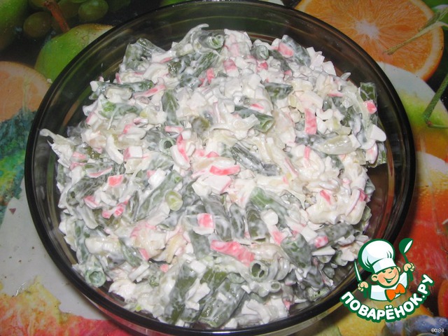 | Простой и вкусный салатик. Очень выручает, когда неожиданно нагрянут гости. Название его я не знаю, поэтому назвала в честь подруги, у которой его попробовала. |