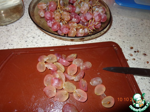 Пока обжаривается печень с луком, виноград режем на половинки, если он с косточками, то их вынимаем.