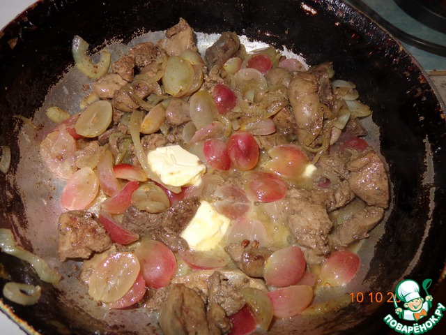 Добавляем виноград к печени, тушим около 3-5 минут, помешивая.