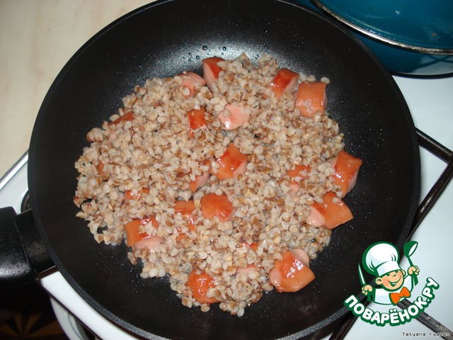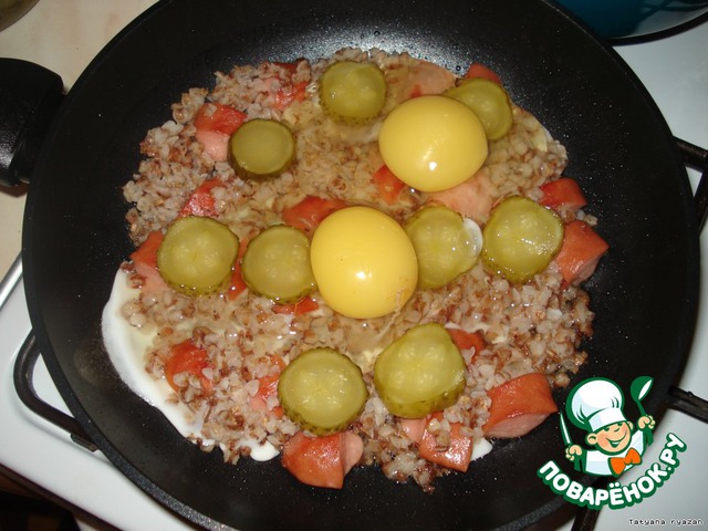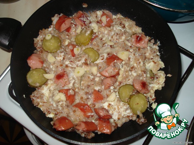 Добавить гречку. Через пару минут добавить солёный огурец, порезанный кружочками.