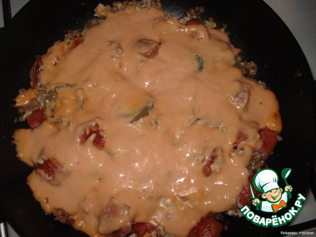Выложить равномерным слоем на сковороду. Не размешивая, продолжать запекать парочку минут на медленном огне.