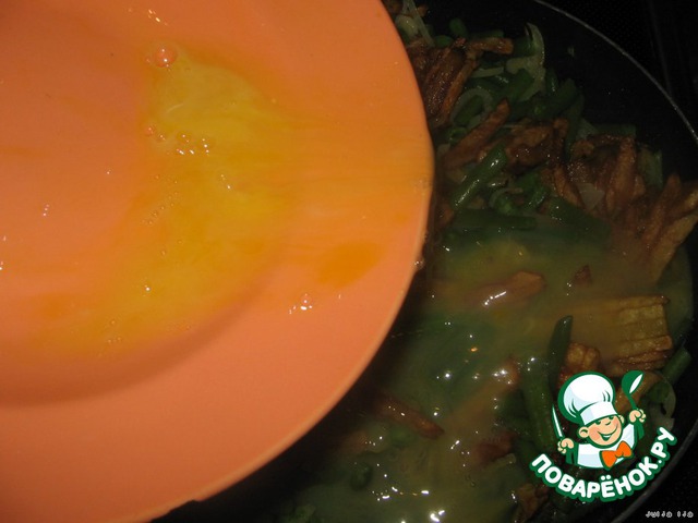 И сразу тщательно перемешать. Обжаривать, пока не схватится яйцо.