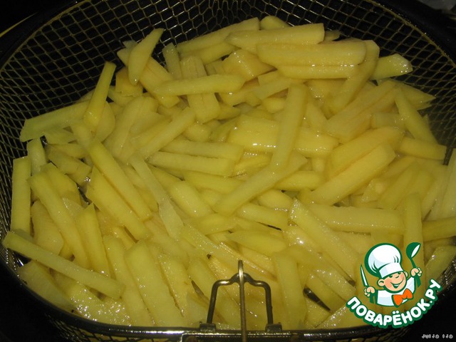 Картофель нарезать соломкой, обжарить на растительном масле.