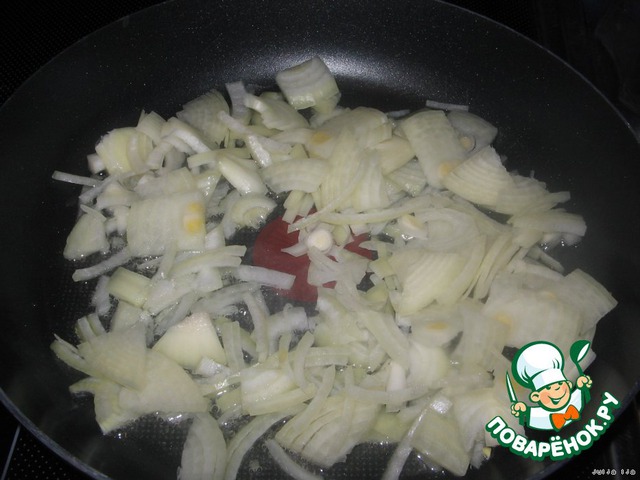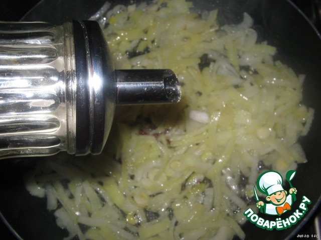 Лук нарезать соломкой, обжарить на растительном масле до золотистости.