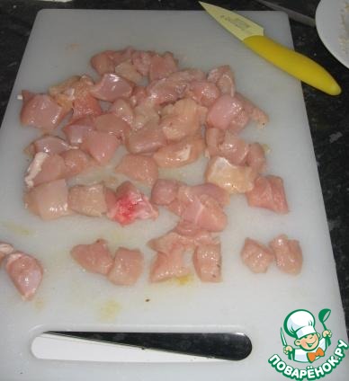 Слегка отбиваем куриное филе (у меня нарезанные грудки были) и режем на небольшие квадратики (размер где то 2 на 2 см).