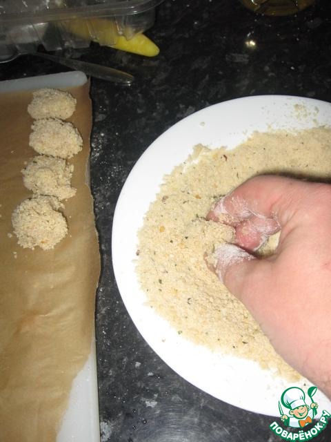 Когда все кусочки курицы выложены, повторяем процедуру с яйцом и крошкой. Перед тем как снова обмакнуть в яйцо постарайтесь немного сжать кусочек, формируя шарик. Так они будут красивей и походить на попкорн. Опять макаем в яйцо, а потом в крошку. У нас получаются вот такие заготовки.
