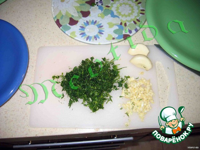 укроп, чеснок, рис, помидор (мелко кубиками порезать) смешать с 1 стол.л. майонеза