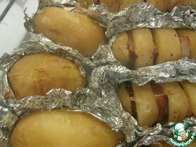 Далее прижимаем друг к дружке ломтики картофеля и бекона, заворачиваем в фольгу и