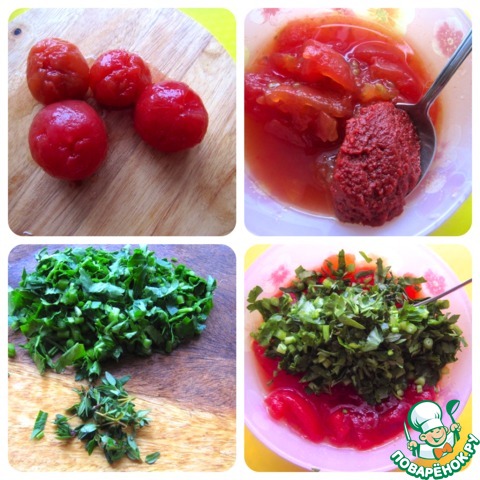 Томаты в собственном соку размять вместе с соком и томатной пастой. Зелень вымыть, обсушить, покрошить произвольно, смешать с томатной заготовкой.