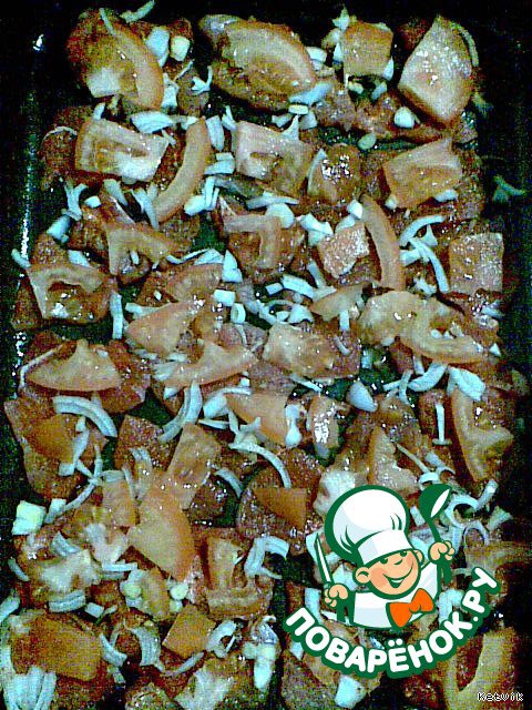 Мясо режем на кусочки и отбиваем как на отбивные, солим, перчим и укладываем на смазанный растительным маслом противень, чтобы покрыть все дно.