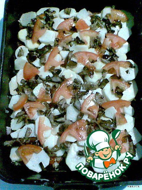 | Принцип приготовления такой же как "Мясо по-французски", только с картофелем. Получается вкусненький ужин, да и на праздничный стол поставить не стыдно. |