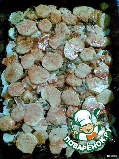 Режем тонкими кружочками картофель, перемешиваем со сметаной (в моем случае майонез), солим, перчим и выкладываем следующий слой.
