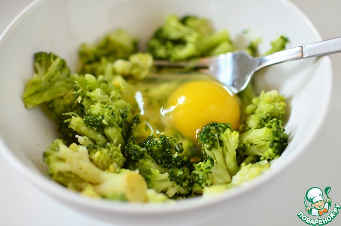 Брокколи смешиваем с яйцом и слегка раздавливаем вилкой на более мелкие кусочки. Солим по вкусу.