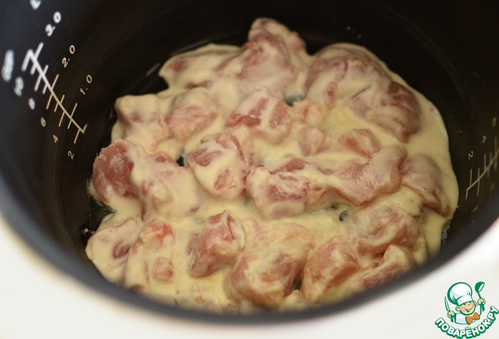 Курица замариновалась и мы собираем запеканку. В чашу мультиварки наливаем немного масла, выкладываем курицу в йогурте.