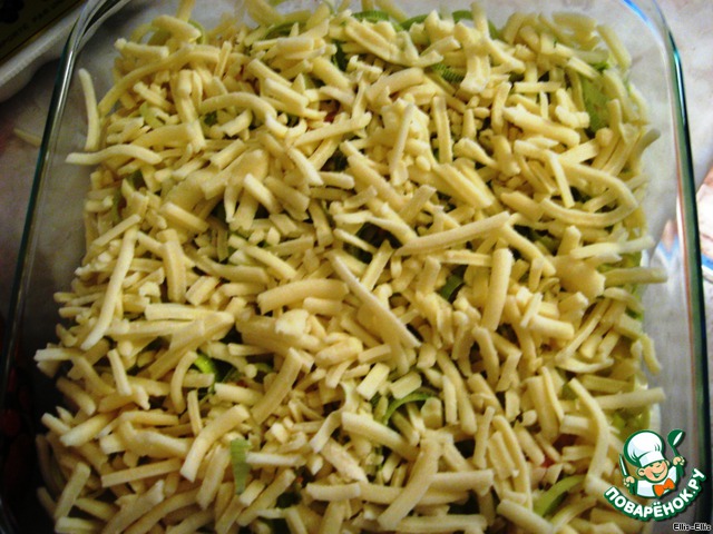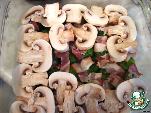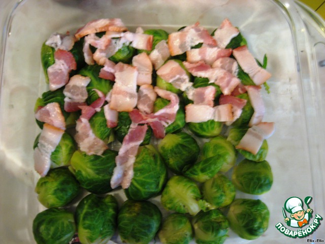 В форму уложить половинки капусты срезом вниз. Сверху выложить слой полосочек бекона. Бекон блюду придает легкую нотку копченостей, т.к остальные ингредиенты достаточно нейтральны по вкусу. У меня совсем тонкий слой.