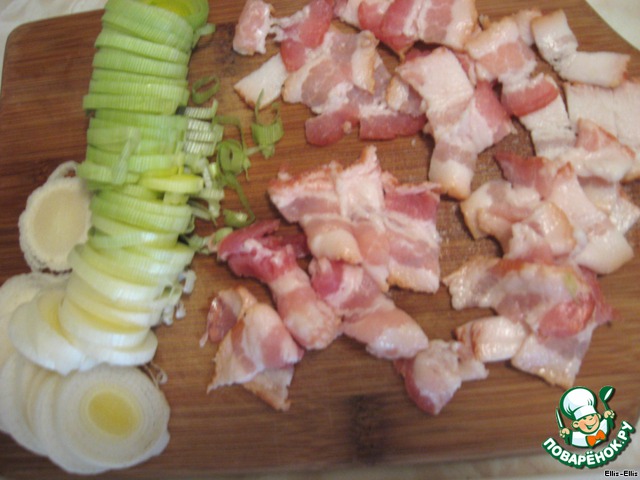 Не тратя время зря порезать лук-порей (белую и немного зеленой части до листьев). Бекон порезать на небольшие кусочки.