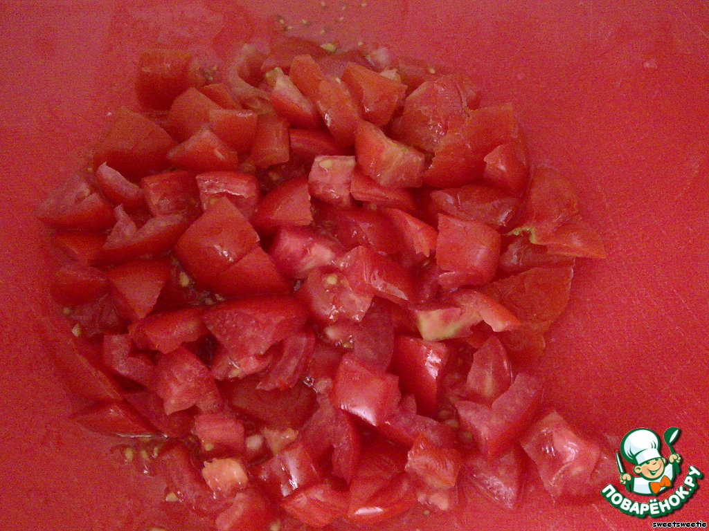 Нарежем помидоры, добавляем к луку.