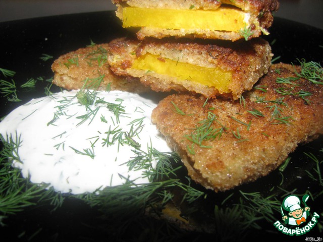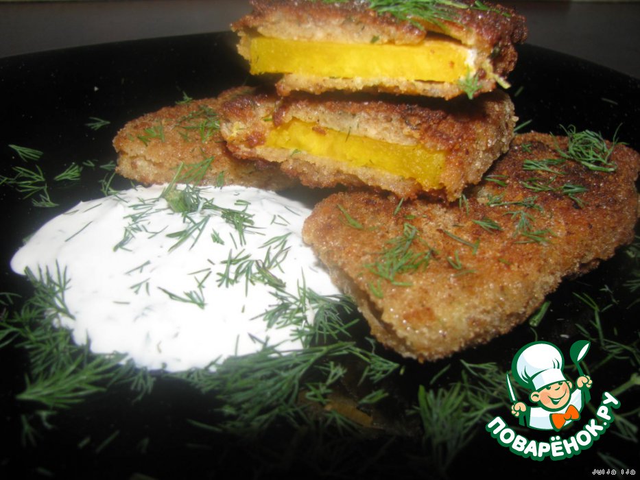 Обжариваем на среднем огне, до хрустящей корочки, с двух сторон. Я боялась, что тыква плохо прожарится, потому готовность проверила ножом (готово было уже через минутки 4).