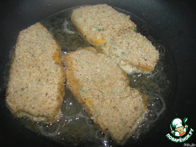 На сковороду, наливаем растительное масло, ставим разогреваться. Пока масло греется, обмакиваем "шницели" в яичную смесь, потом в сухари, потом опять смесь и сухари, то есть получается двойная панировка.