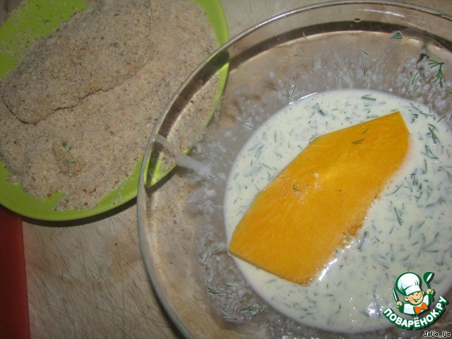 Для кляра, разбиваем яйцо, добавляем 1 ст. ложку сметаны, мелко нарезанный укроп, немного соли и мускатный орех. Панировочные сухари высыпаем в тарелку.