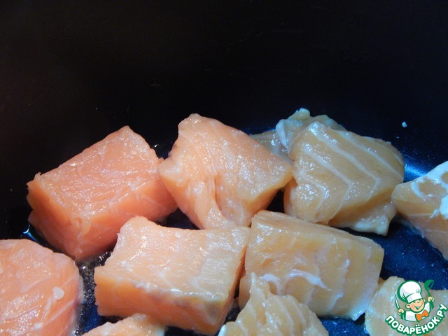 Рыбу нарезаем кубиками размером приблизительно 3х3 см. Включаем мультиварку в режим Поджаривание, растапливаем сливочное масло и выкладываем рыбу. Обжариваем ее 3 минуты. Сбрызгиваем лимонным соком.