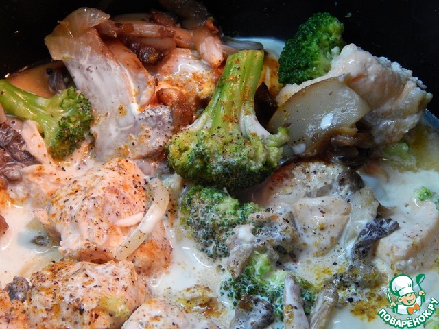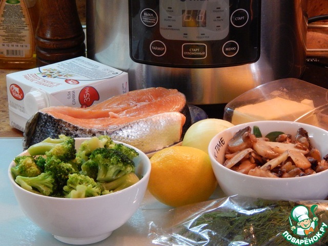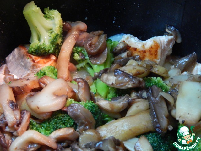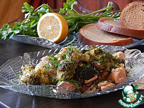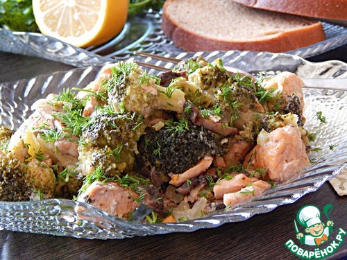 Рецепт "Рагу из красной рыбы с шампиньонами и брокколи":