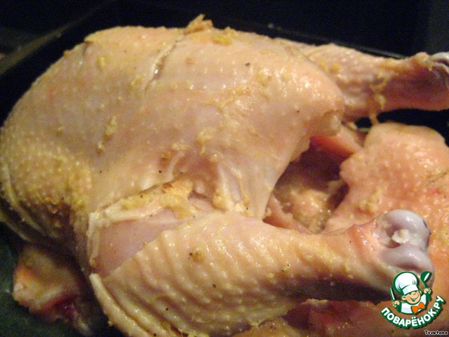 Перемешиваем и обмазываем этим нашу куроньку как снаружи, так и внутри. Оставляем в холодильнике часика на 2-3.