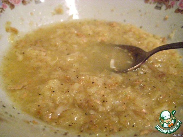 Тем временем делаем маринад: трем имбирь на терке (имбирь брать по вкусу, я брала корешок сантиметров 15 длиной), трем чесночок, смешиваем, заливаем вином и соком половинки лимона.