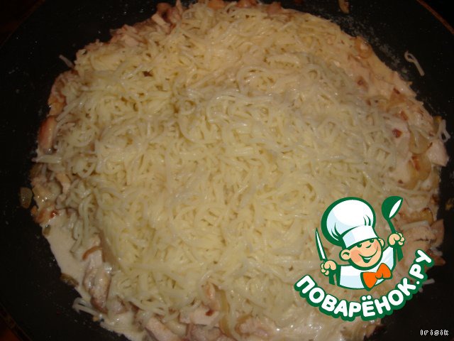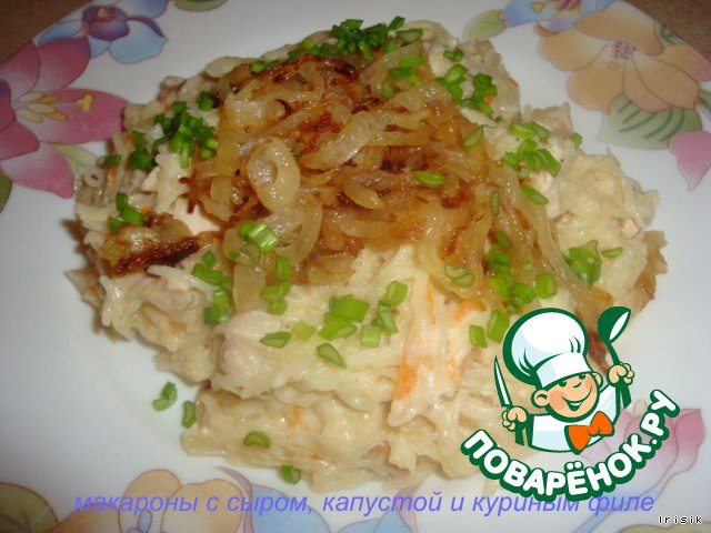 Макароны с сыром, капустой и куриным филе