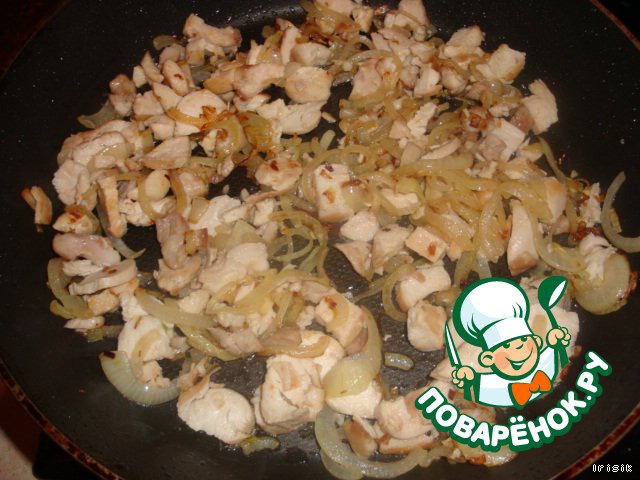 Куриное филе нарезать ровными, некрупными кубиками и добавить к луку. Обжарить пару минут.