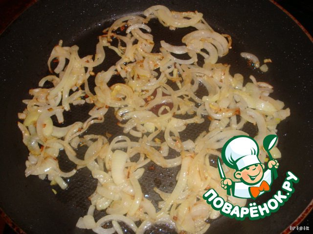 Лук очистить, нарезать тонкими полукольцами и обжарить до золотистого цвета.