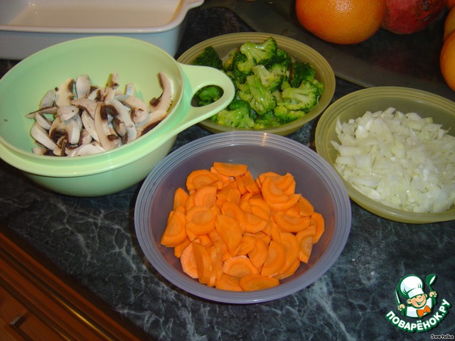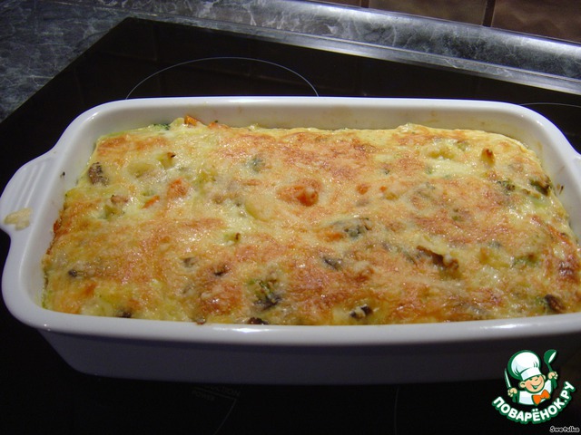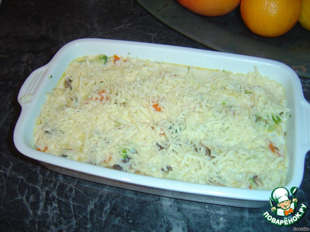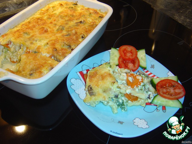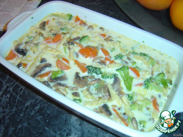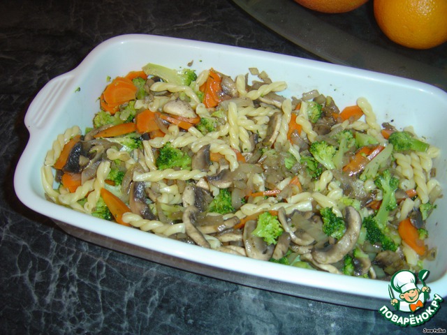 5. Вермишель, овощи и грибы перемешать в форме для запекания.