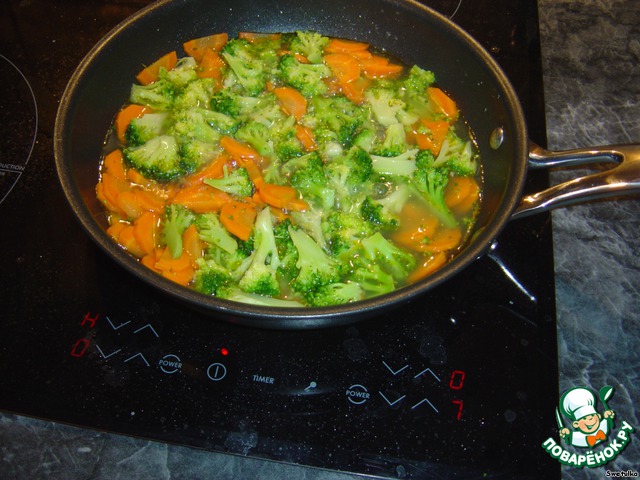 Даём закипеть, накрываем крышкой и тушим 2 минуты. Добавляем брокколи и тушим ещё 3 минуты. Откидываем овощи на дуршлаг, бульон не выливаем.