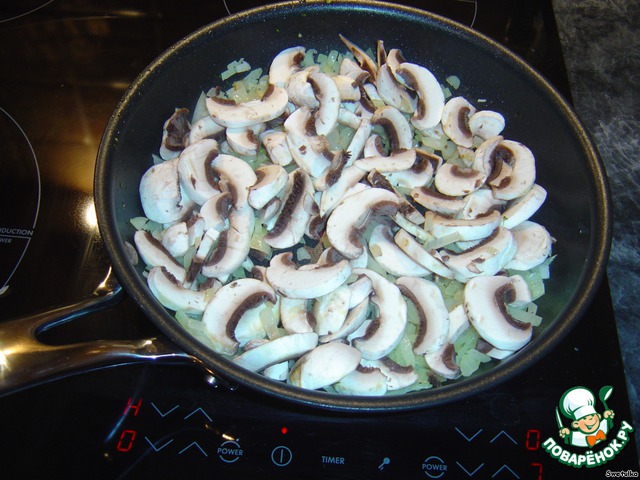 4. 1 ст.л. оливкового масла нагреваем на сковороде, жарим грибы с луком. Добавляем соль, перец и тмин по вкусу. Молоко, бульон и яйца взбить и посолить.