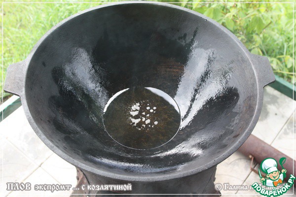 Первым делом плеснул в казан граммов стопятьдесят масла и раскалил его.