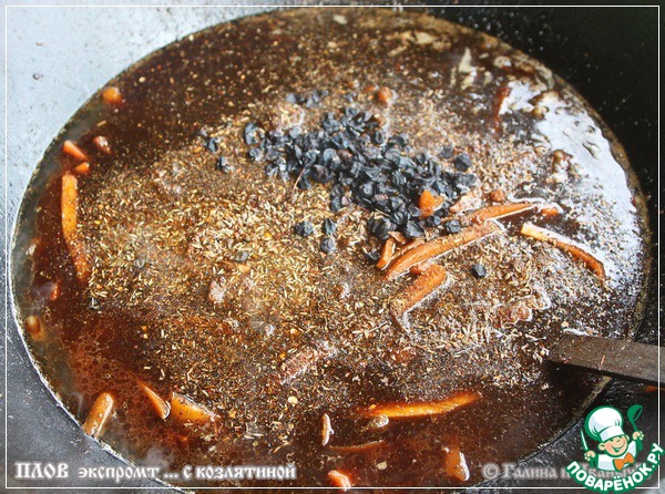 … заливаею в казан воду. Лучше кипяченную, т. е. просто – кипяток. И ложку, полторы добавил специй. И барабарису добавил. Добрую горсть. Я очень люблю эти кисленькие вспышки в процессе поедания плова, поэтому и не жалею его никогда.