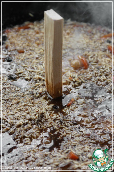 Подготовьте палочку. По мере впитывания рисом воды, надо делать отверстия такие в теле плова будущего. Так чтобы до самого дна доставали. Пусть зирвак проникает снизу вверх и рис пропитывает.
