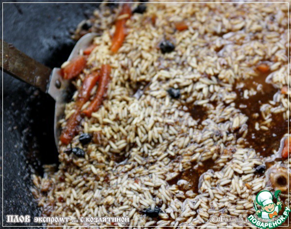И еще. Шумовкой, время от времени, рис от стенок казана отодвигайте, чтобы не пригорало, во-первых, и это помогает жидкости, которая еще в казане есть перемещаться и рис обвалакивать.