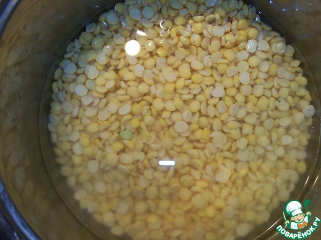 Заранее подготовленный (вымоченный)горох заливаем небольшим количеством воды и ставим вариться на 30 минут.
