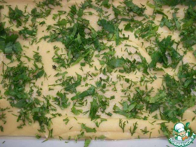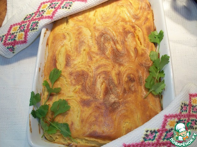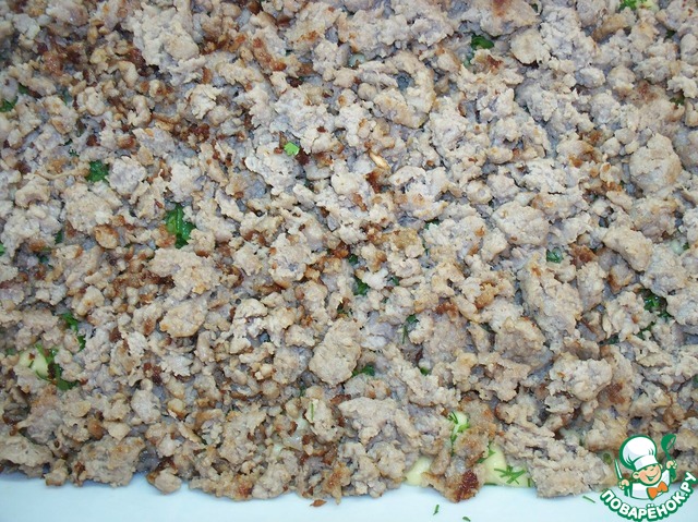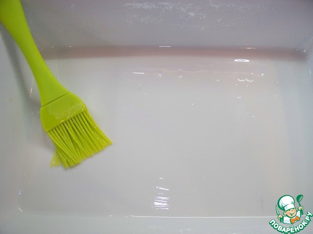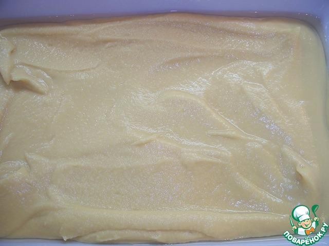 Сверху опять гороховое пюре. Сверху смазываем сливками. Затем ставим в духовку на 30 минут.
