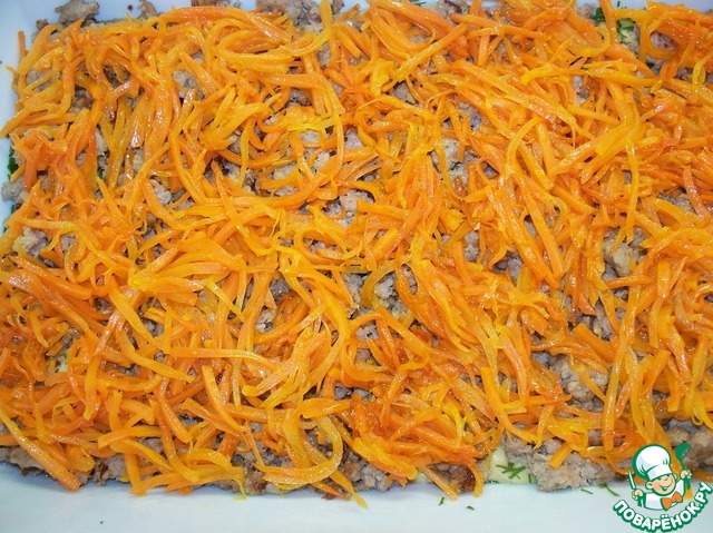 Морковь натираем и обжариваем в 1 ложке масла до готовности. Далее обжариваем фарш до готовности.