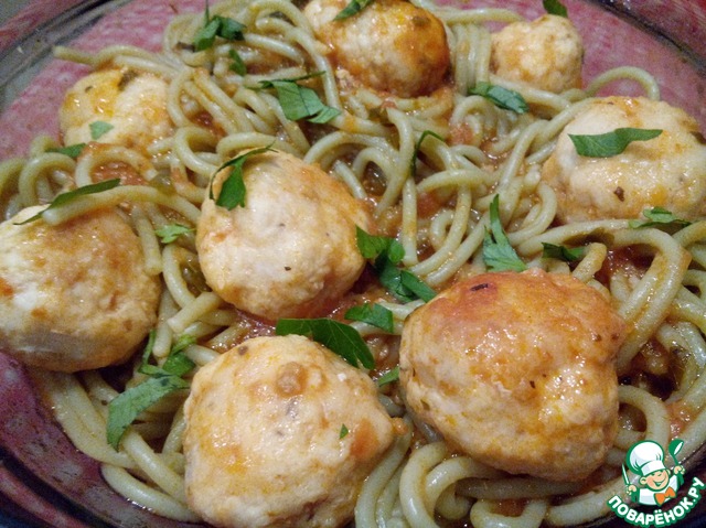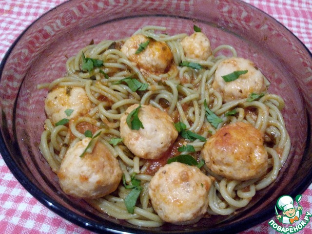 Подавать спагетти с мясными шариками в томатном соусе смешанными в глубокой тарелке. Украсить измельченной зеленью или листиками базилика.