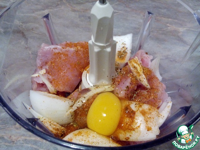 Приготовить фрикадельки: лук, мясо, немного соли, специи и яйцо сложить в комбайн и сделать фарш.